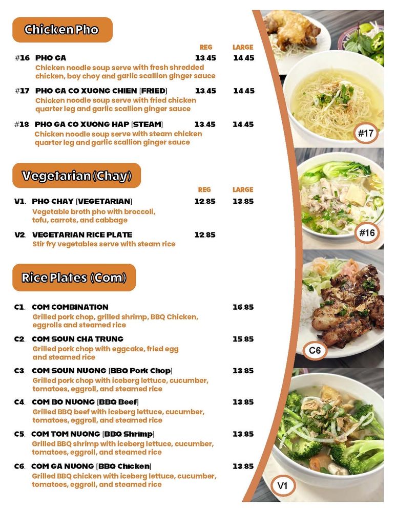 Highlights include their Pho Bo, a rich beef noodle soup simmered for 24 hours, allowing the flavors to meld perfectly. Choices like the Combination Beef Pho and Bun Rieu showcase the kitchen's skill in crafting comforting, flavorful dishes that warm the soul. Customers rave about the aromatic broths and generous portions, with each bowl offering a unique taste experience.